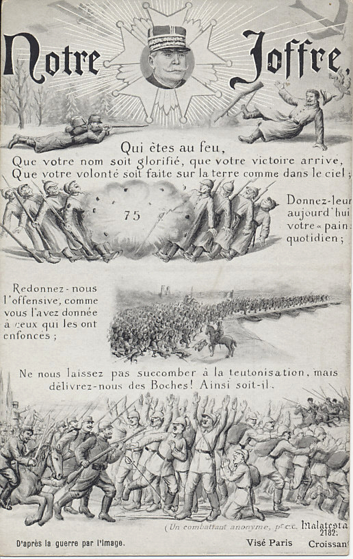 Notre JoffreQui êtes au feu,Que votre nom soit glorifié, que votre victoire arrive,Que votre volonté soit faite sur la terre comme dans le ciel;Donnez-leur aujourd'hui votre 'pain' quotidien;Redonnez-nous l'offensive, comme vous l'avez donnée à ceux qui les ont enfoncés;Ne nous laissez pas succomber à la teutonisation, mais délivrez-nous les Boches! Ainsi soit-il.75(Un combattant anonyme, pr. c.c.Malatesta 2182.D'après la guerre par l'image.Visé Paris CroissantOur JoffreWho art the fire,So that your name will be glorified, so that your victory will come,Thy will be done on earth as in heaven;Give them today your daily 'bread';Give us back the offensive, as you have given it to those who have driven them back;Do not let us succumb to Teutonisation, but deliver us from the Boches! So be it.75 [the French 75mm field gun](An anonymous fighter, private C.C.Malatesta 2182.After The War in Images.Referred Paris CroissantReverse:Guerre Européenne de 1914-1915.Édition PatriotiqueEuropean War 1914-1915.Patriotic edition