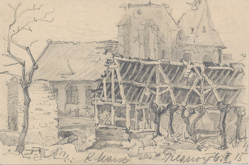 1915, Fresnoy, Fresnoy-le-Grand, drawing, trench art, church, February, 1915-02-06, Marx