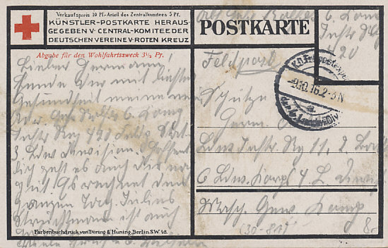 RS (BS?) 15Reverse:Postmarked October 9, 1916.Künstler-Postkarte herausgegeben vom Central-Komitee der deutschen Vereine von Roten KreuzAbgabe fur den Wohlfahrtszweck 3 1/2 Pfennig.Farbenbuchdruck von Döring & Huning, Berlin, SW. 48.Artist Postcard published by the Central Committee of German Associations of the Red CrossLevy for charitable purposes 3 1/2 pfenning.Color letterpress by Döring & Huning, Berlin, SW. 48th