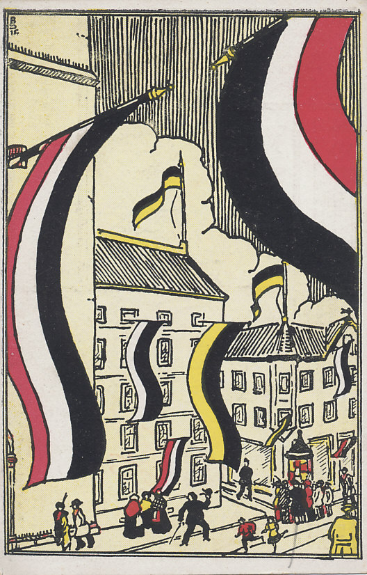 "City street scene with German and Austro-Hungarian Hapsburg flags — the Dual Alliance — and a group clustered around a kiosk, likely reading war news and casualty lists. By RS (BS?) 1915. Postmarked October 9, 1916."