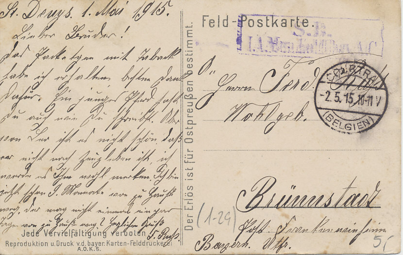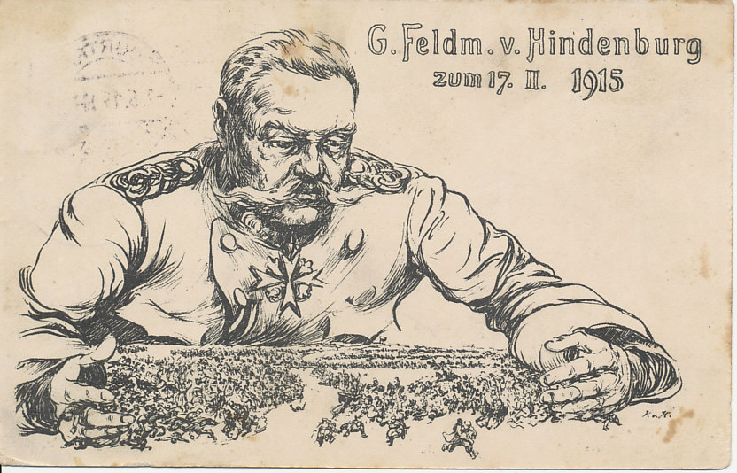 G. Feldm. v. Hindenburg zum 17. II. 1915General Fieldmarshall von Hindenburg February 17, 1915.Reverse:Jede Vervielfältigung verbotenReproduktion u. Druck v.d. bayer. Karten-FelddruckereiDer Erlös ist für Ostpreußen bestimmtA.O.K.6.Any reproduction forbiddenReproduction and printing by the Bavarian Field Card PrinterThe proceeds will go to East PrussiaMessage dated May 1, 1915, field postmarked May 2 from Courtrai, Belgium.