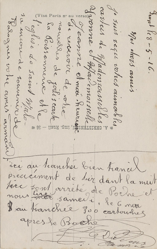 L'arc-en-ciel des AlliésThe Allies' RainbowReverse:Message from the front dated May 8, 1916. . . ici au tranchée bien trancil précisément de dire dant la nuit . . . et nous tire le samedi le 6 mai au tranchée 300 cartouches apres le Bochehere the very precisely cut trench to say that night. . . and in the trenches on Saturday, May 6 we fired 300 cartridges after the Boche