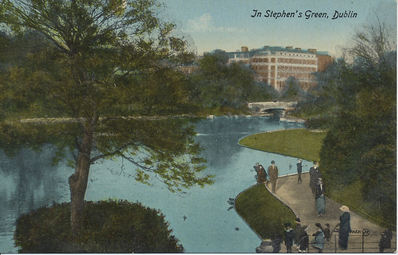 Postcard view of Stephens Green, Dublin, Ireland. During the Easter Rising of April, 1916, rebel forces entrenched in and held the Green under the command of Countess Constance Gore-Booth Markievicz, Irish Wife of a Polish count, and a member of the Irish Citizens Army, a militia formed by James Connolly and Jack White, to protect trade union members in the aftermath of the seven-month long Dublin Lock-out of 1913.