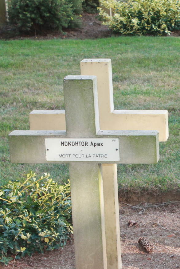 Russian graves of Nokohtor Apax and Minenko-Maziav Kolodeyschak in Cerny-en-Laonnois Cemetery, France, the men possibly killed in the Second Battle of the Aisne, fighting alongside the French. Kolodeyschak died May 1, 1917.
