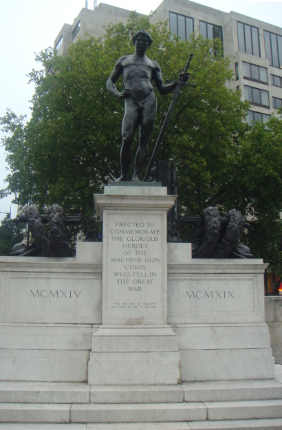 Machine Gun Corps Memorial, Hyde Park, London, England. A statue of David is flanked on either side by a wreathed Vickers machine gun. © 2013 by John M. Shea