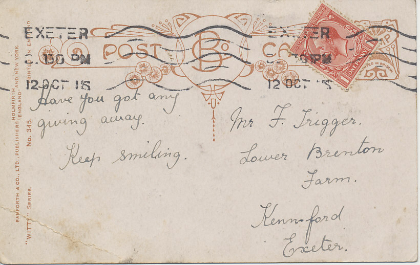 A British woman laments the loss of 'poor John' who has been called up. A postcard by D. Tempest, postmarked October 12, 1915.