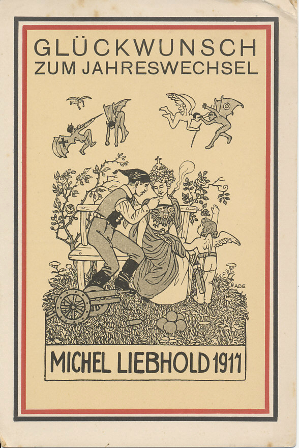 A New Years postcard, 1917, of Germania wooed while Cupid draws attention to the angels and devils battling overhead. On the wings of the demons are the rondels of the Allies and a Maltese cross of the Germans. The Cannon by the lovers has been spiked and disabled. The card, illustrated by ADE, was from Leutnant Michel Liebhold, an officer on anti-aircraft train 61.