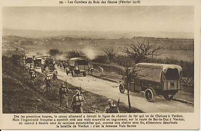 Soldiers and trucks advancing to and returning from Verdun along the Verdun-Bar-le-Duc road that became known as the Voie Sacrée, the Sacred Way. Under constant German bombardment, the road was maintained by thousands, some of whom can be seen shoveling dirt or gravel to fill holes. The Bois des Caures was in the northeastern corner of the Verdun sector, and was an area subjected to the first German assault of February 21 and 22, 1916.