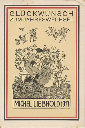"Flandern 1918 Prosit Neujahr!" — Happy New Year! from Flanders, 1918, a church steeple is in the distance, woods, and a green field. In the foreground ruins of a building and a bare tree. German watercolor.