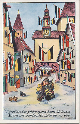 Austro-Hungarian trench art pencil drawing on pink paper of a soldier in a ragged, many-times-patched uniform, labeled 'Bilder ohne Worte' (No Comment, or Picture without Words). Kaiser Karl who succeeded Emperor Franz Joseph is on reverse. The printed text on the reverse is in Hungarian and German.