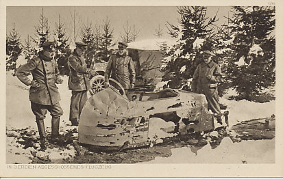The nacelle or car of an airplane, likely a pusher plane, shot down in Serbia being examined by German officers.