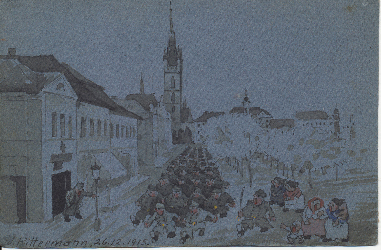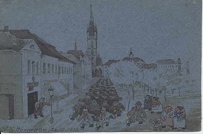 Austro-Hungarian soldiers marching through a city, their officers bawling orders. Women and a child watch and talk, possibly shouting to be heard over the marching feet. An original watercolor on blue paper, signed W. Rittermann or Pittermann, December 26, 1915.