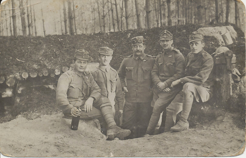 Austro-Hungarian soldiers, one with goggles around his hat, posing at their dugout in a January, 1917 photograph. The card is dated January 27, 1917, and field postmarked January 31.