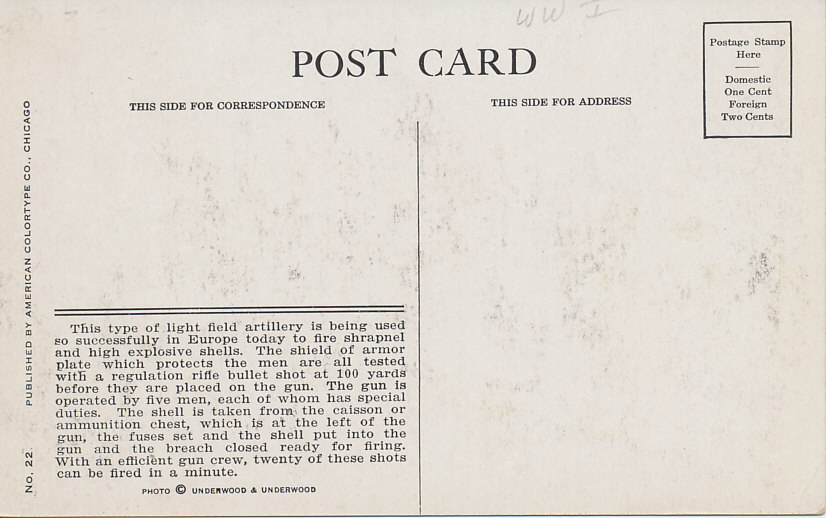 A 3-inch field piece in actionReverse:This type of light field artillery is being used so successfully in Europe today to fire shrapnel and high explosive shells. The shield of armor plate which protects the men are all tested with a regulation rifle bullet shot at 100 yards before they are placed on the gun. The gun is operated by five men, each of whom has special duties. The shell is taken from the caisson or ammunition chest, which is at the left of the gun, the fuses set and the shell put into the gun and the breach closed ready for firing. With an efficient gun crew, twenty of these shots can be fired in a minute.No. 22 Published by American Colortype Co., ChicagoPhoto © Underwood & Underwood