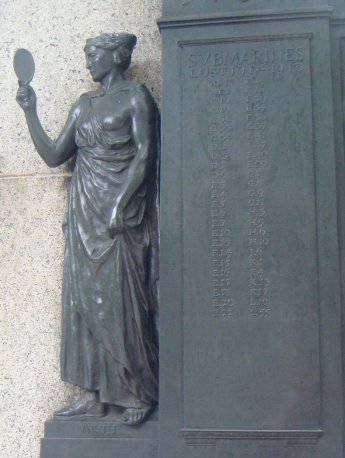 "Detail from the National Submarine War Memorial on the Embankment in London, United Kingdom: the submariners manning the machine and some of the forces seeking its destruction. The Memorial lists the British submarines lost in the World Wars I and II."
