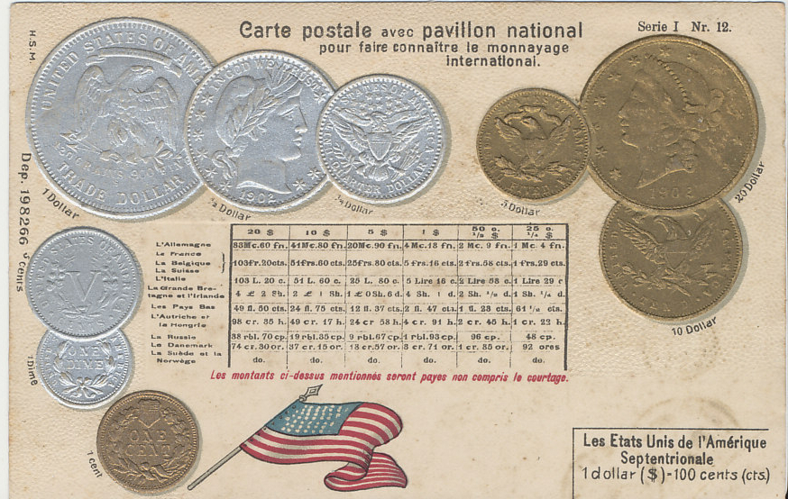 Currency card for the United States, with American coins, currency conversions, and the national flag.