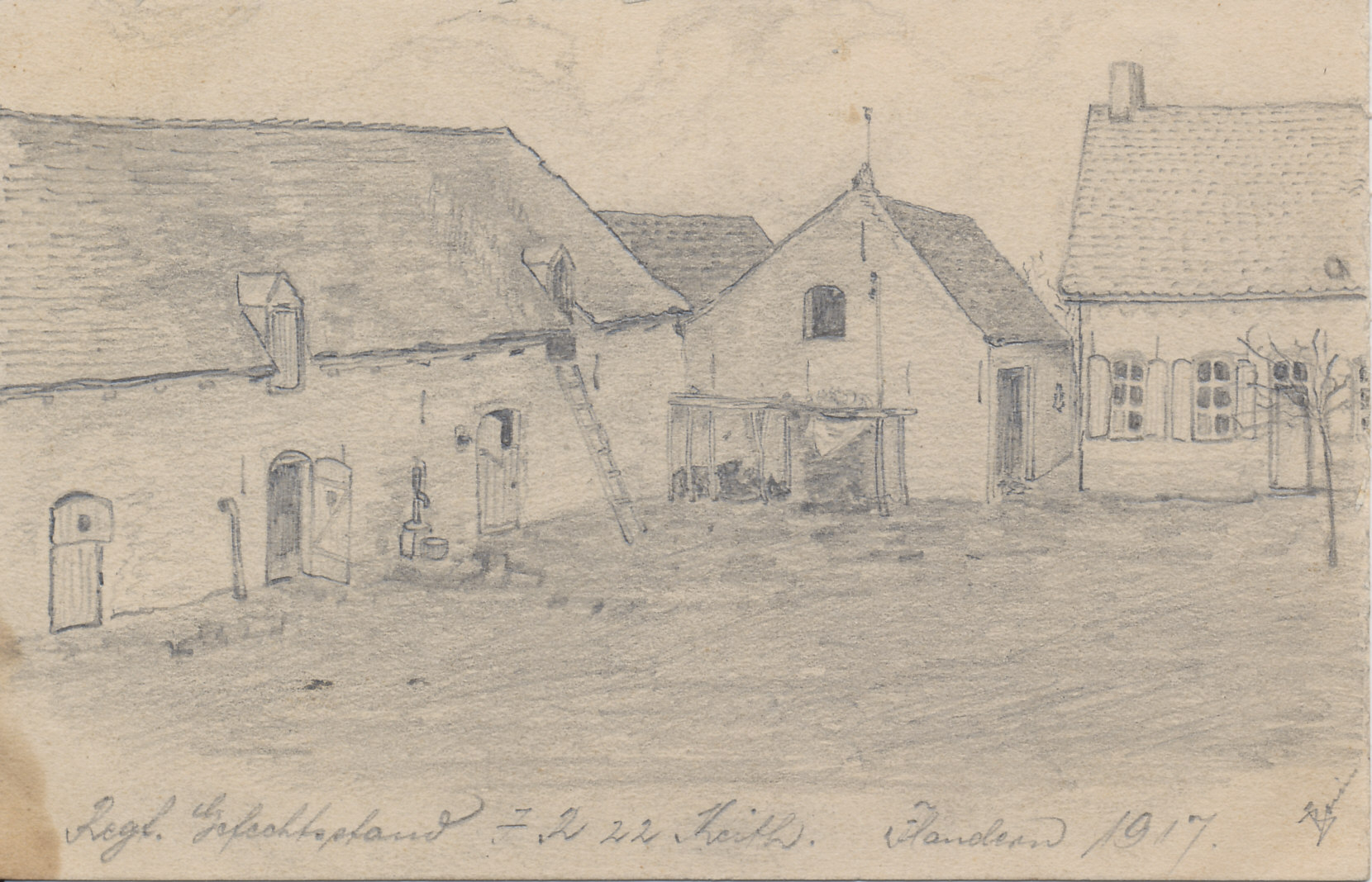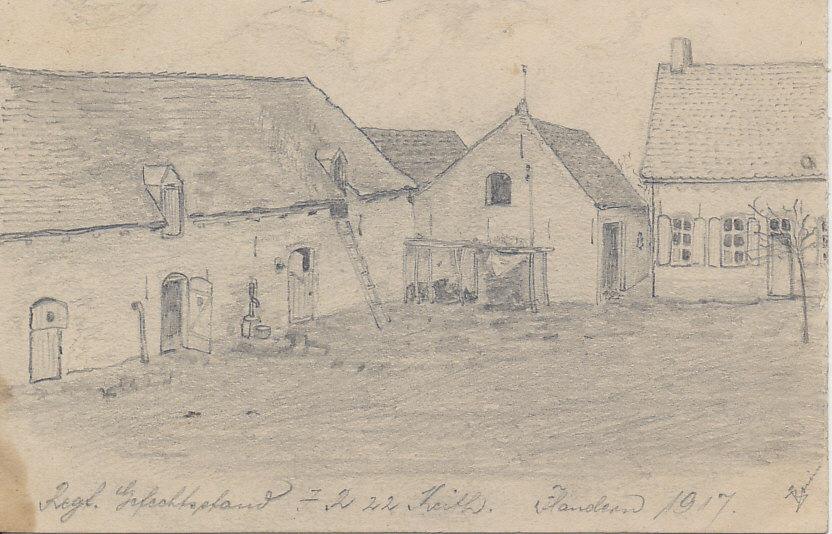Regimental Command Post. A 1917 German pencil sketch of a farm house and barn in Flanders serving as a regimental command post. I cannot make out the name of the artist.