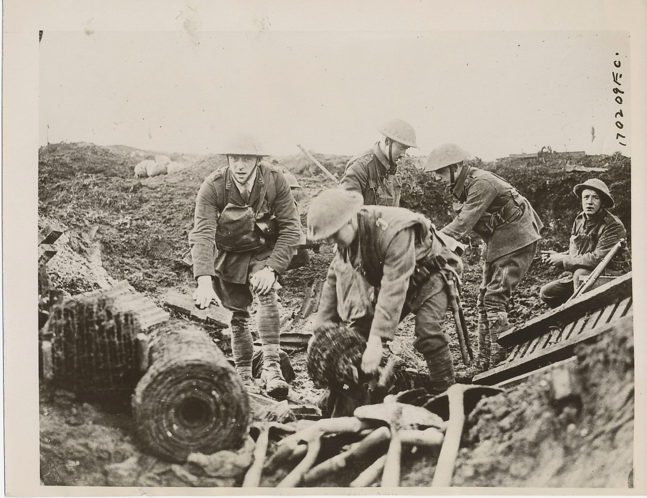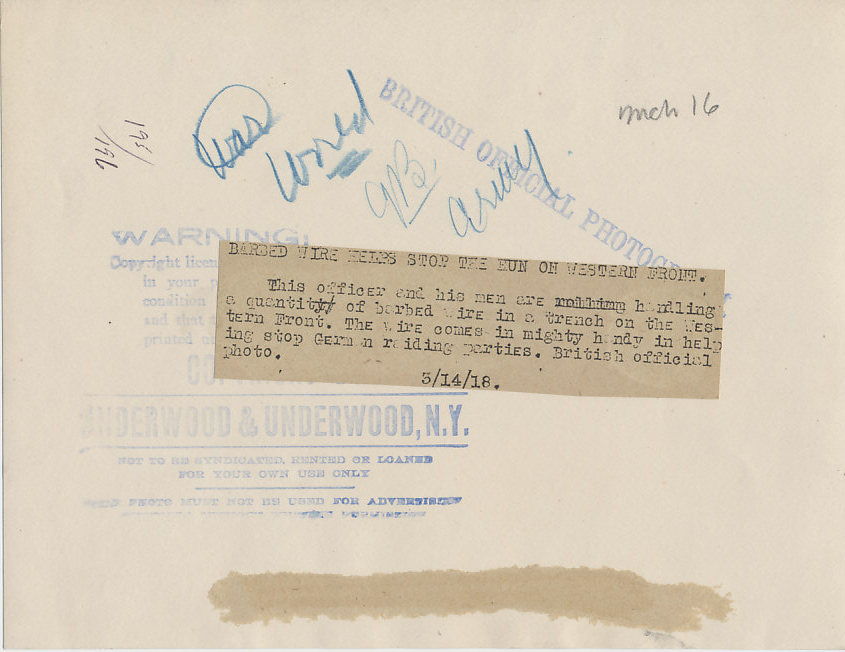 Reverse:Barbed wire helps stop the Hun on the Western Front.This officer and his men are handling a quantity of barbed wire in a trench on the Western Front. The wire comes in mighty handy in helping stop German raiding parties. British official photo. 3/14/18.