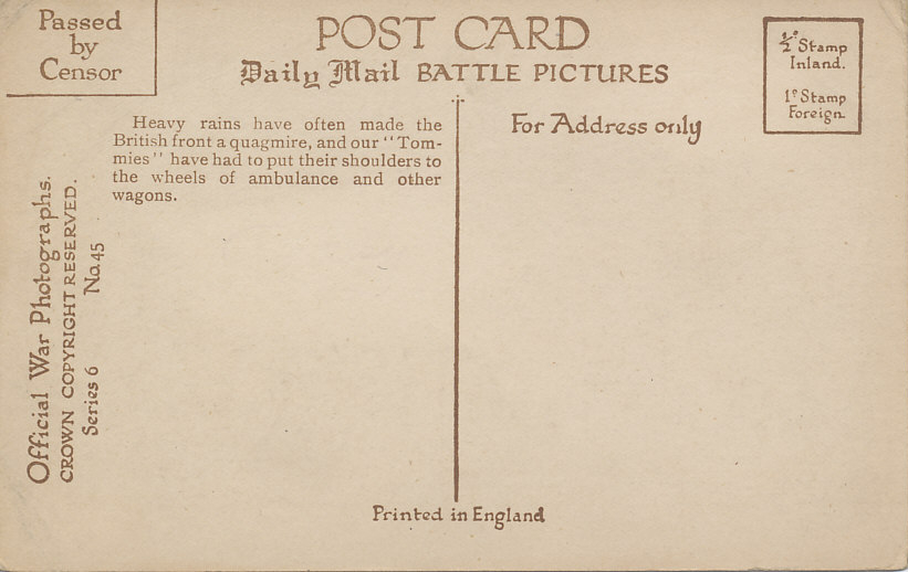 Helping an ambulance through the mud.Official PhotographDaily Mail War PicturesReverse:Passed by CensorHeavy rains have often made the British front a quagmire, and our 'Tommies' have had to put their shoulders to the wheels of ambulance and other wagons.Official War PhotographsCrown Copyright Reserved.Series 6 No. 45