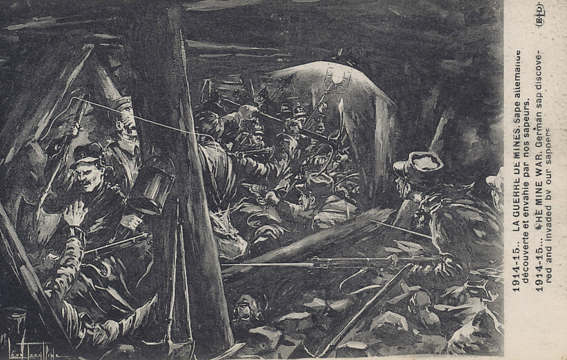 1914-15 . . . La Guerre de Mines. Sape Allemange découvert et envahie par nos sapeurs.1914-15 . . . The Mine War. German sap discovered and invaded by our sappers.Logo: ELDReverse:Imp. E. Le Deloy, Paris.