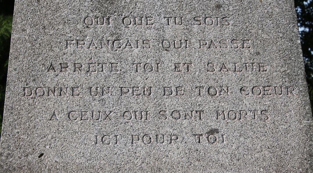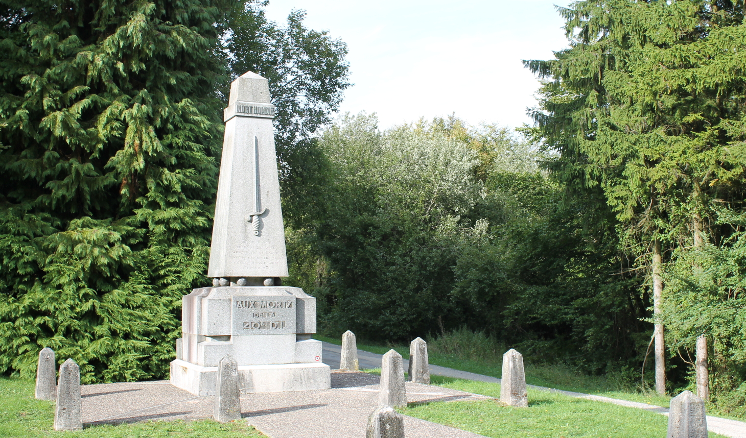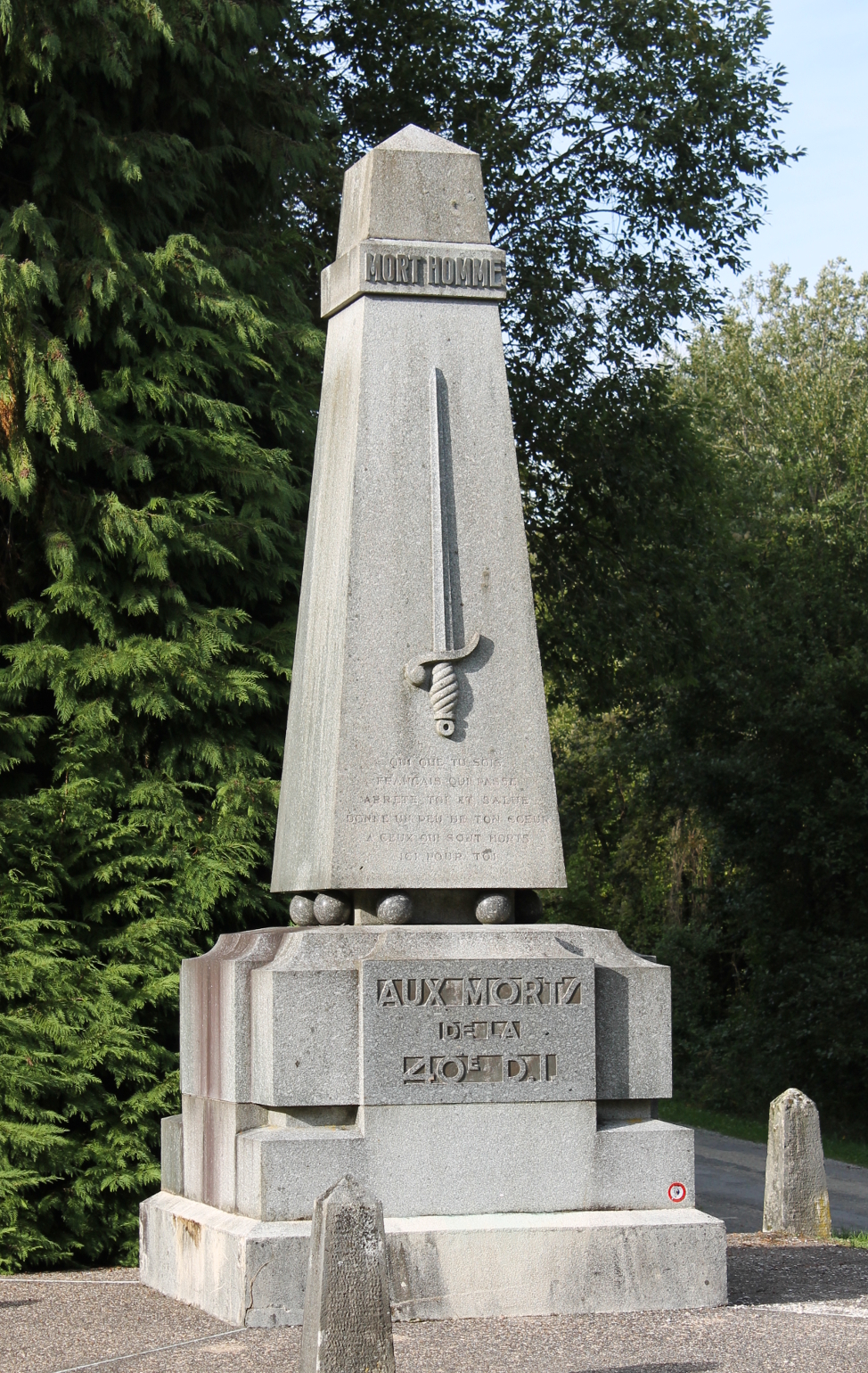 Mort-HommeAux Morts de la 40e D.I.To the Dead of the 40th Infantry DivisionThe inscription below the sword reads:Qui que tu sois Français qui passe arrete toi et salue donne un peu de ton coeur a ceux qui sont morts ici pour toiYou French who pass, stop; salute; and give a bit of your heart to those who died, died here, for you.