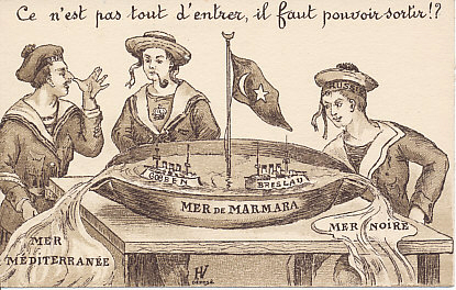 It's not just entering, you have to be able to get out! On August 8, two German battleships, Goeben and Breslau, entered Turkish waters in the Dardanelles Strait. The ships passed the forts that defended the Strait along the northern and southern shores, crossed the Sea of Marmora, and, at the mouth of the Bosphorus leading to the Black Sea, anchored in Constantinople, capital of Turkey. Althought the French and English could lie in wait for them to re-enter the Mediterranean, the Russian Black Sea fleet had no match for Goeben. The narrow flowing to the Mediterranean is the Dardanelles, that to the Black Sea is the Bosphorus. Card by HV.