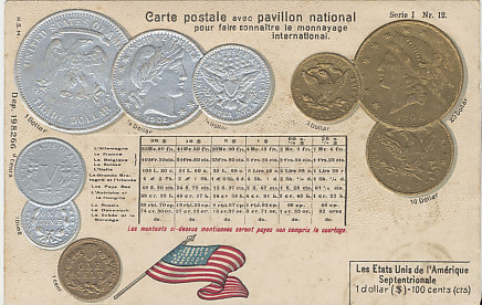 Currency card for the United States, with American coins, currency conversions, and the national flag.
