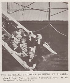 The imperial children bathing in the Black Sea at Livadia, the Tsar's palace in Crimea. Anna Viroubova, the Empress's confidante, holds Tsarevitch Alexie on her lap. The Tsar's four daughters are in black. A nurse sits on the upper step. Photograph from Viroubova's 'Memories of the Russian Court.'