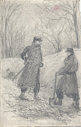 Original pencil sketch of French soldiers — a bespectacled officer and men — entrenching in a snowy wood. The message on the reverse is dated '30 Xber', that is, December 30, likely 1914 judging by the uniforms of the soldiers.