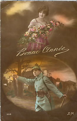 Happy New Year! A French postcard from 1916 of a woman with a garland of flowers surmounting a French soldier in the powder blue uniform and Adrian helmet introduced in 1916. The soldier points, perhaps beyond the ruins behind him, perhaps to the future, the setting sun, or the cloudy, fiery sky behind him. The message on the reverse, dated December 21, 1916, is from Walter in France to 'Dearest Rose'. A friend of Walter is going to England in a week, but Walter's heart is set on Australia and, presumably, Rose. He hopes the war ends soon. Card by E.M.