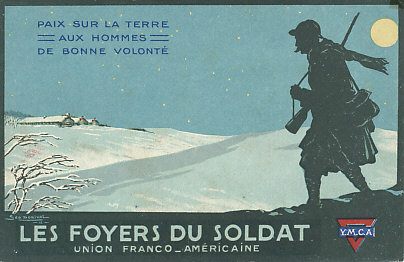 Peace on Earth, and Good Will toward Men. A French poilu seeks shelter in a soldier's home. A YMCA postcard by Geo. Dorival, 1918.