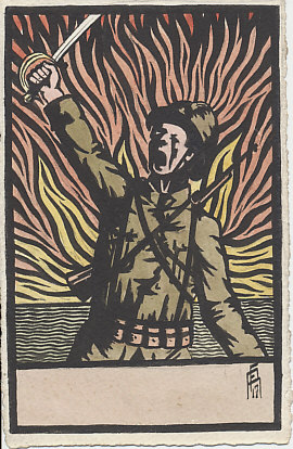 A French officer charging into battle in a watercolor by Fernand Rigouts. The original watercolor on deckle-edged watercolor paper is signed F. R. 1917, and addressed to Mademoiselle Henriette Dangon.