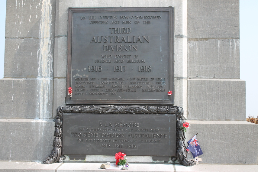 A plaque on the monument reads:To the officers non-commissioned officers and men of theThird Australian DivisionWho fought in France and Belgium1916 * 1917 * 1918Messines 1917 * The Windmill * 3rd Battle of Ypres * Broodseinde * Passchendaele * Morlancourt * Treux Hamel * 8th August * Proyart * Suzanne * Bray-sur-Somme * Curlu * Clery-sur-Somme * Bouchavesnes * Roisel * Hindenburg LineBeneath this is the garlanded French plaque:À la Mémoiredes officiers, sous-officiers et soldats de laTroisième Division AustralienneQui ont combattu en France et en Belgique1916 * 1917 * 1918