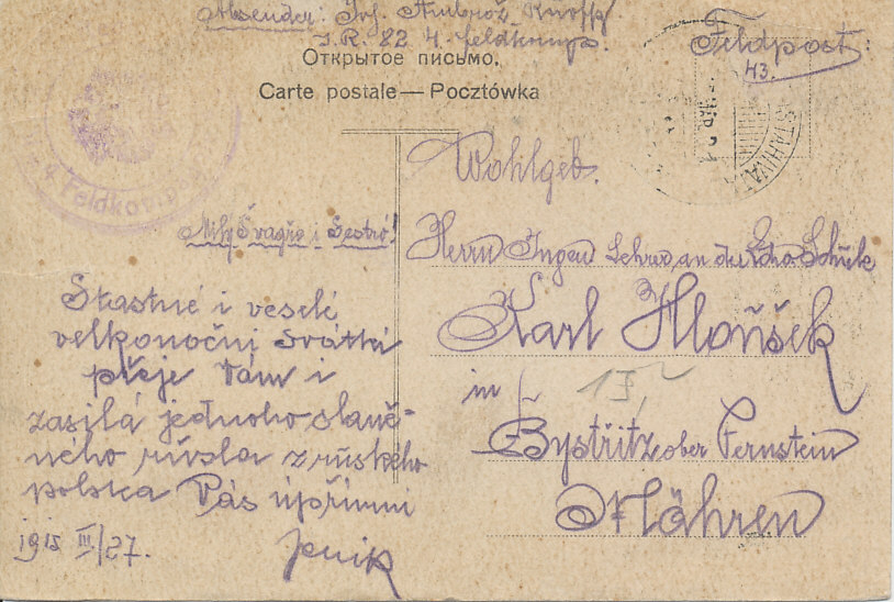 A mass of German troops bear an enormous egg striped in the black, white, and red of the german flag. Atop the egg, a cannon is fired by troops with a Hungarian flag. The target, diminutive in the distance, is Paris, Eiffel Tower gray against the brown city.The watercolor is labeled,Husvét . Páris piros tojása . 1918Easter . Red eggs for Paris . 1918The front of the card is postmarked 1918-04-05 from Melököveso.The card is a Feldpostkarte, a field postcard, from Asbach Uralt, old German cognac. Above the brand name, two German soldiers wheel a field stove past a crate containing a bottle of the brandy under the title Gute Verpflegung, Good Food. Above the addressee is written Einschreiben, enroll, and Nach Ungarn, to Hungary. The card is addressed to Franz Moritos, and is postmarked Hamburg, 1918-03-30. A Hamburg stamp also decorates the card.A hand-painted postcard by Schima Martos. , Germany on registered fieldpost card, 1918, message: Red Egg for Paris, Easter, 1918.The German advance in Operation Michael in the March, 1918 nearly broke the Allied line, and threatened Paris, putting it once again in range of a new German supergun capable of hitting the city from 70 miles away.
